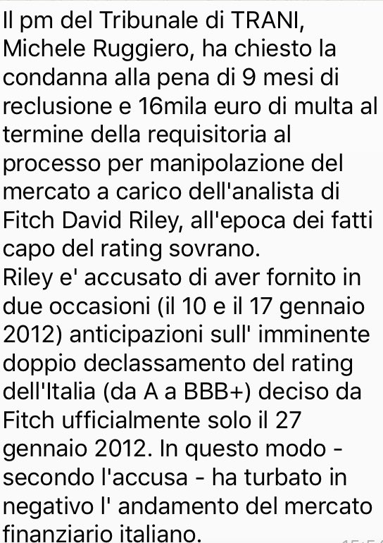 Nella giornata di ieri il pm del Tribunale di Trani, Michele Ruggiero, ha chiesto la condanna alla pena di 9 mesi di reclusione e 16mila euro di multa a carico dell’analista di Fitch David Riley, all’epoca dei fatti capo del rating sovrano. Riley e’ accusato di aver fornito in due occasioni (il 10 e il 17 gennaio 2012) anticipazioni sull’imminente doppio declassamento del rating dell’Italia (da A a BBB+) deciso da Fitch ufficialmente solo il 27 gennaio 2012. In questo modo – secondo l’accusa – ha turbato in negativo l’andamento del mercato finanziario italiano”.