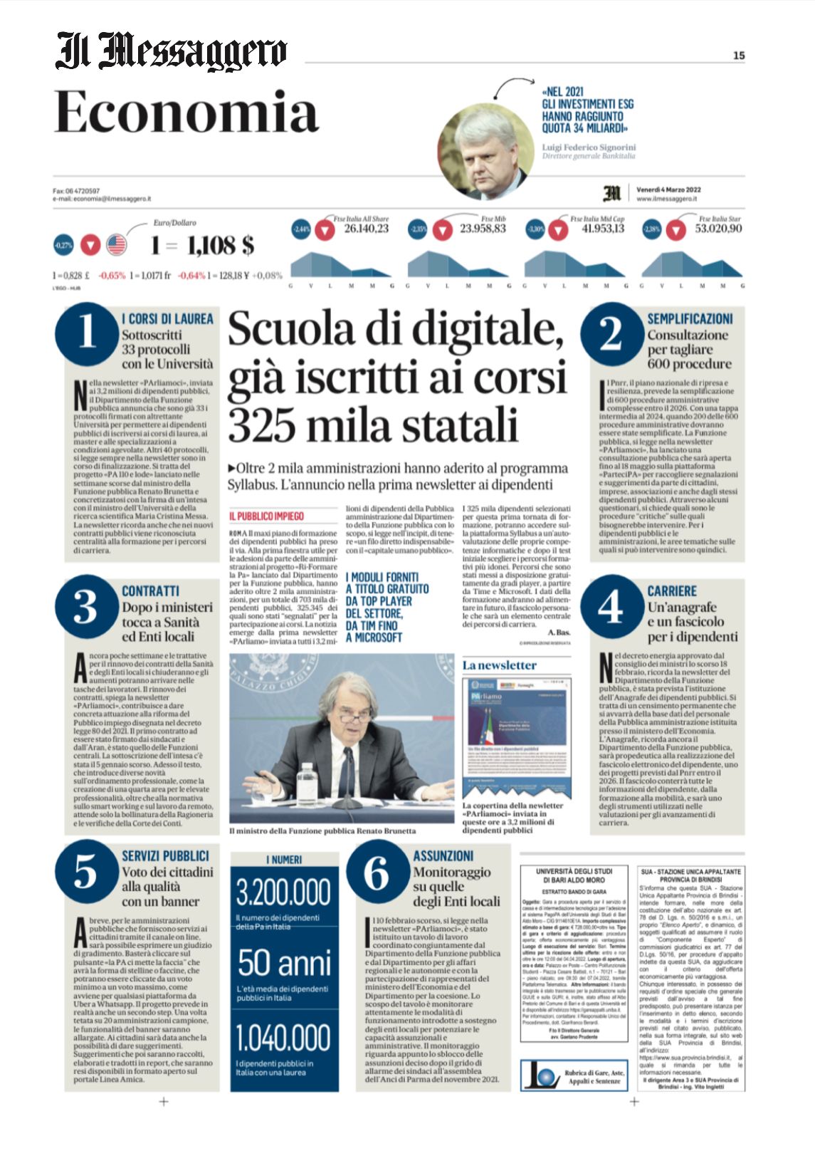 “Scuola di digitale, già iscritti ai corsi 325mila statali. Oltre 2mila amministrazioni hanno aderito al programma Syllabus. L’annuncio nella prima newsletter ai dipendenti” (Andrea Bassi, ‘Il Messaggero’)